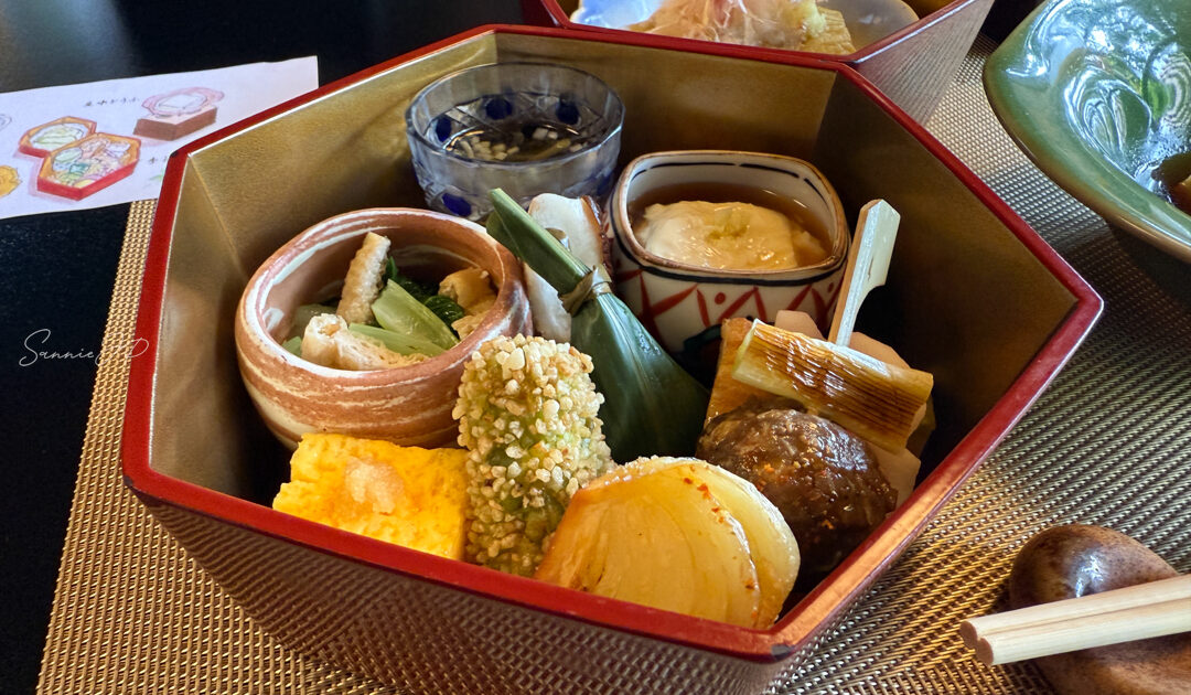 最初に供された季節の彩り重は、一口サイズで季節の食材を多彩な調理法で仕上げた、美しくも味わい深いひと皿。それぞれが主役級の存在感で、目でも舌でも楽しめます。