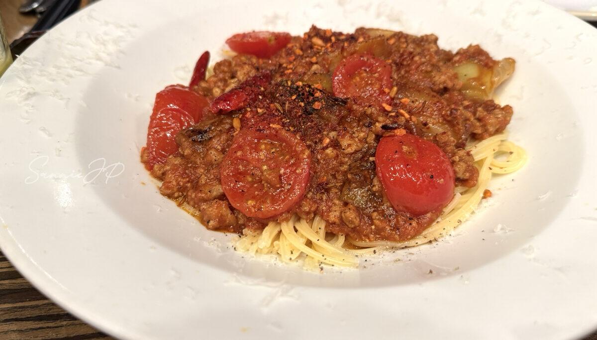 名前だけでは少し分かりづらいのですが、トマトベースのパスタです。焼いたネギも入っており、これがまた美味しい。焼いたネギをパスタに入れるとこんなに美味しいんだと、ちょっと感動すら覚えました。