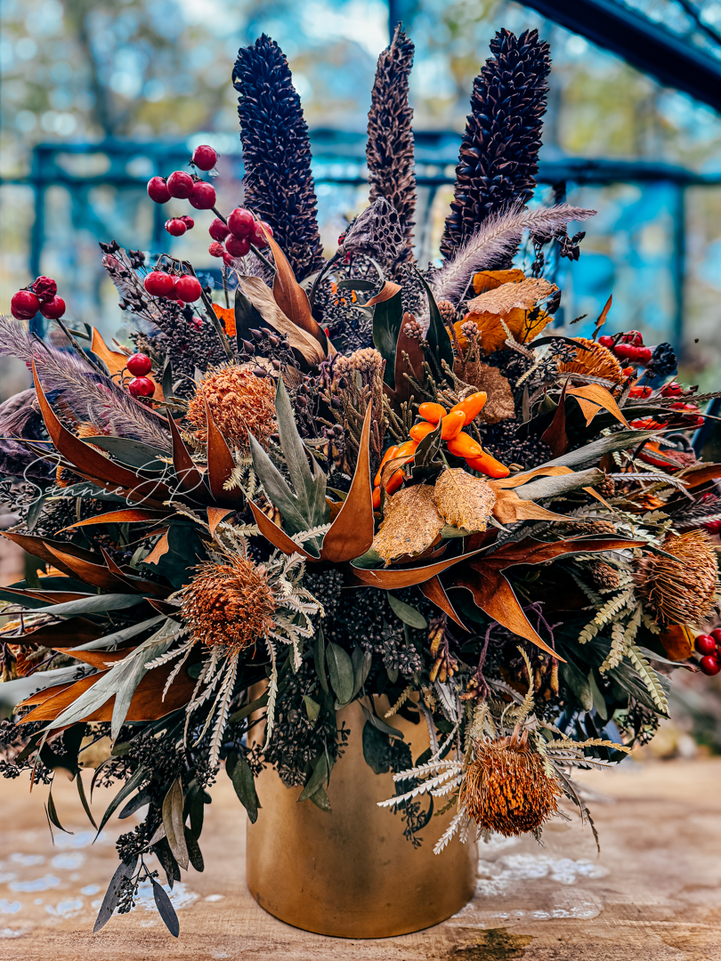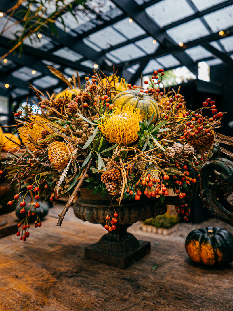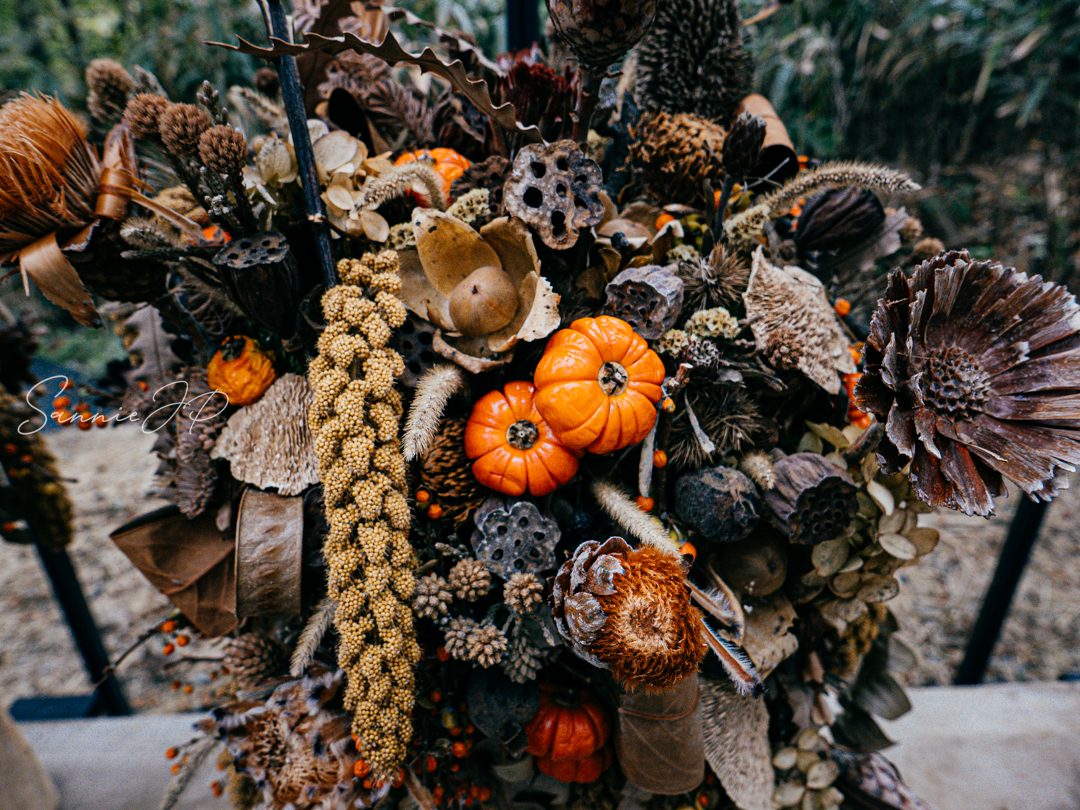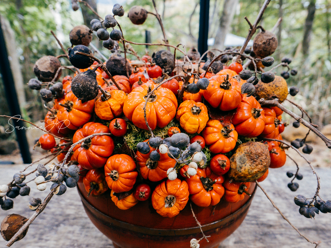 敷地内のいたるところに、秋らしい配色のドライフラワーのブーケが展示されていました。