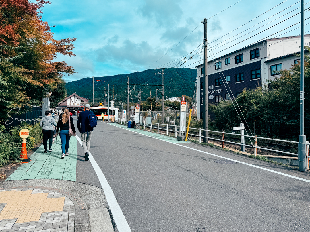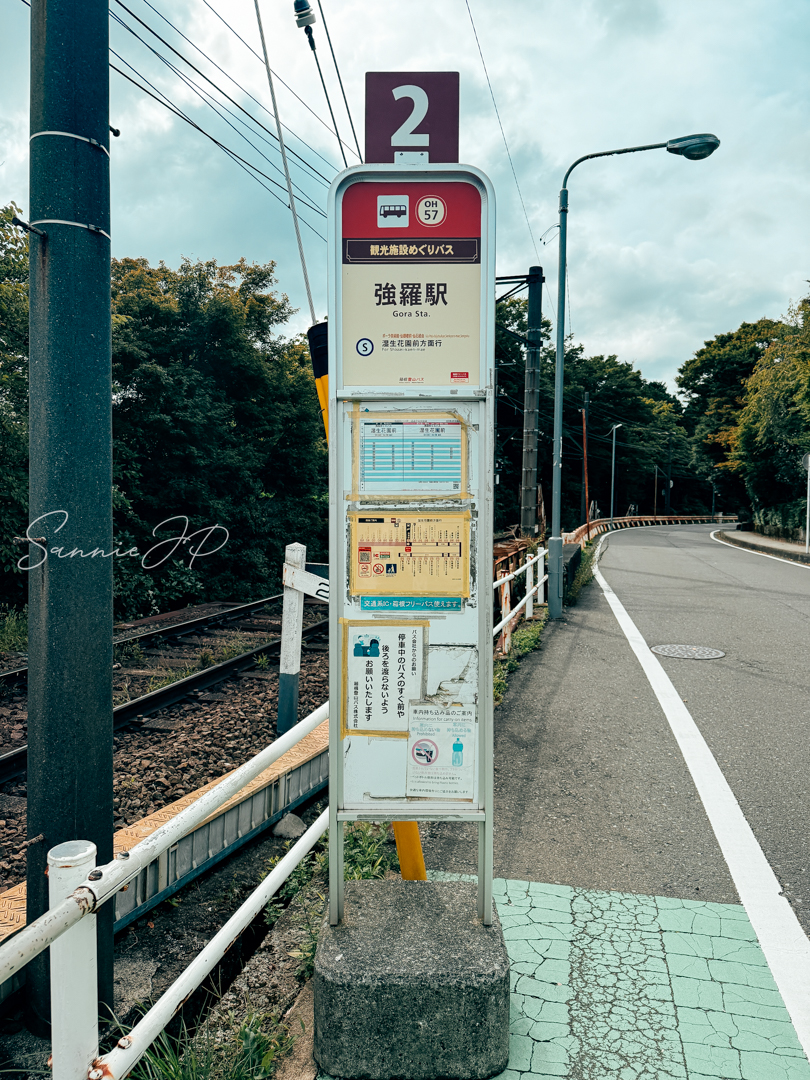強羅駅の手前でバス停がいくつか並んでいますが、ニコライ・バーグマン箱根ガーデンズ行きは線路沿いのバス停です。